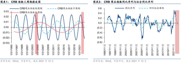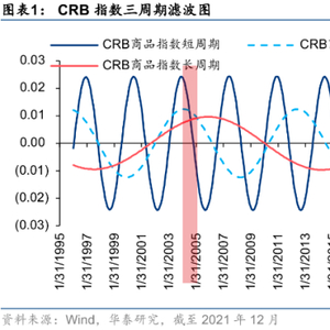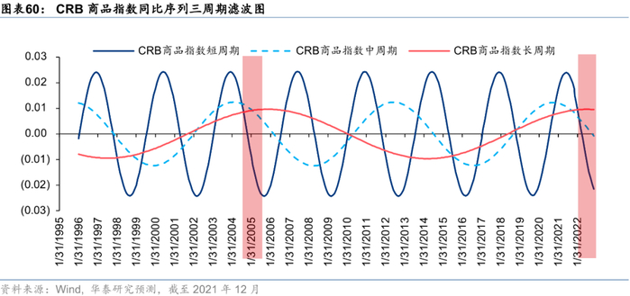 具体来看, CRB指数同比序列拆分出的三周期滤波在2022年表现不一:短周期滤波下行,将于2022年中下穿零轴,体现在原始序列上则是上半年增速明显减缓、下半年调头下行;中周期下行但同比序列为正,说明中周期仍能为CRB指数提供支撑但支撑力度逐渐减弱;长周期位于上行顶部区间,为CRB指数提供一定支撑。三周期滤波的回归拟合结果显示,2022年CRB指数同比增速将持续下降,导致商品走势相对弱于2021年,但长周期仍能够为指数提供一定支撑,大幅下行概率不大。且从历史周期状态来看,当前短周期下穿零轴、中周期在正值区间下行、长周期位于顶部的周期状态与2004-2005年区间类似,在该区间内大宗商品价格仍处于上涨状态,但同比增速有所回落,可从侧面支持这一观点。