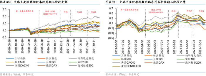 对应上述三阶段的划分,本轮基钦周期全球主要股票指数及其同比序列的走势如下图所示。可以看出,在第一阶段各股指呈现攀升趋势,同比序列同步上升;第二阶段股指减速上升,同比序列在正值区间略微下滑;第三阶段各主要股指略有分化,多数股指横盘震荡,同比序列则震荡下行。