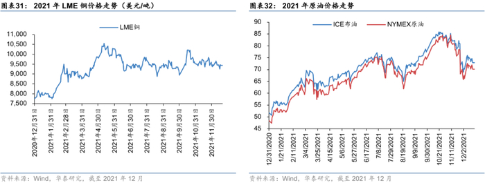 对于具体的商品品种,我们主要考虑LME铜、SHFE螺纹钢和ICE布油的走势与投资机会。2021年在基钦周期上行的背景下,铜价触及高点后高位震荡,一、二季度受疫情带来的货币宽松、矿端供给偏紧以及经济边际复苏等影响,LME铜价稳步上升,于2021年5月创历史新高点(每吨10416美元),并从三季度开始一直维持震荡格局。2021年油价则总体维持70美元/桶高位震荡,油价的短期表现受产油国供给量变动影响较大。