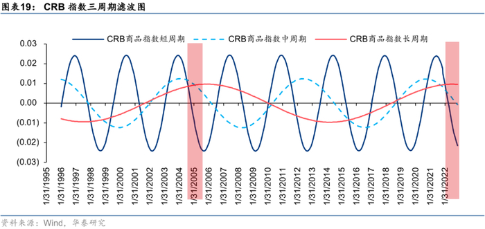 在华泰金工的前期研究中,我们论证了股票、债券、大宗商品、房地产四大类资产中,如果按照贴近实体经济的程度排序,应是大宗商品 > 股票 > 债券 > 房地产,大宗商品对实体经济的变化最敏感,适合作为基本面状态的观测窗口,因此后文我们提取CRB综合现货指数的三周期来表征实体经济的周期状态。