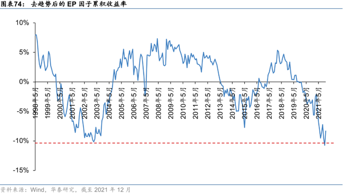 2021年A股市场高估值股票仍有较好表现,随着2022年流动性的宽松,预计低估值因子仍难有较好表现。但从下方图中可以观测到,经历了两年的估值扩张后,热点行业股票的估值已经处在历史较高水平,EP因子累积收益率已处于1998年5月以来历史最低水平,一旦投资者对流动性预期发生转变,EP估值因子走势或将回归周期上行轨道。届时股票估值将受到压制,高估值股票将面临较大风险,而低估值股票或将迎来更高配置价值。