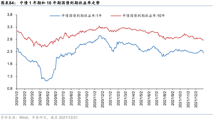对于债券资产的投资机会,我们首先结合流动性环境进行分析。从下图可以看出,2020年初疫情爆发,国内国债到期收益率大幅下行,但4月触底之后快速回升至疫情冲击前的水平。整个2021年国债收益率震荡微跌。