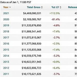 据IMDbPro统计,2021年北美全年票房定格于44.69亿美元,同比2020年的21.03亿美元回升112.5%。当然,与两年前的113.2亿美元相比,2021年仅恢复至四成左右,距离巅峰期仍相距甚远。