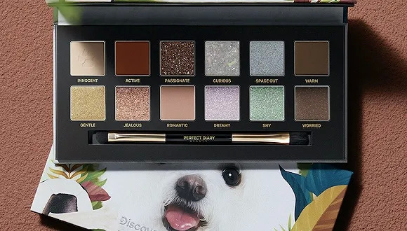 典型如头部电商主播李佳琦的爱宠never,2020年2月24日,李佳琦在直播中,官宣never代言完美日记小狗盘,小狗眼影盘正面为never的大头照,眼影盘包含了12种色号,其中,Innocent色盘(第一排第一个)里有个深深的狗爪,据说是根据never的“悍妇”形象定制。