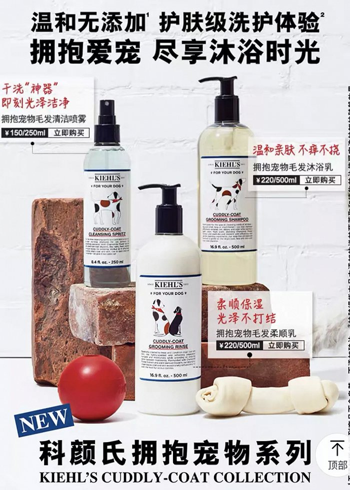 譬如,美国护肤品牌科颜氏便推出了“拥抱宠物系列”护理套装。据科颜氏表示,自1851年创立,其始终致力于为消费者带来卓效温和的产品,呵护每一位家庭成员——包括家中可爱的宠物们。于是,在2006年,便推出了拥抱宠物系列(适用于狗),而今,这一系列全新升级配方,携毛发清洁喷雾、毛发沐浴乳、毛发柔顺乳等产品重新上市。