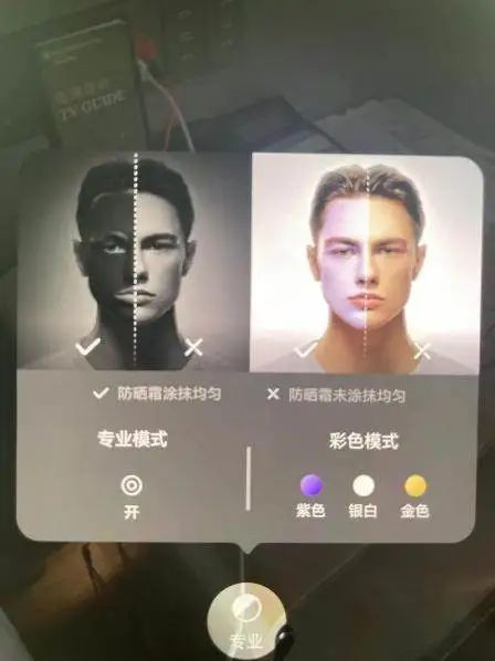 “防晒检测”功能具体为,将涂抹后的化学防晒霜可视化成像,可辅助用户判断防晒涂抹状态。