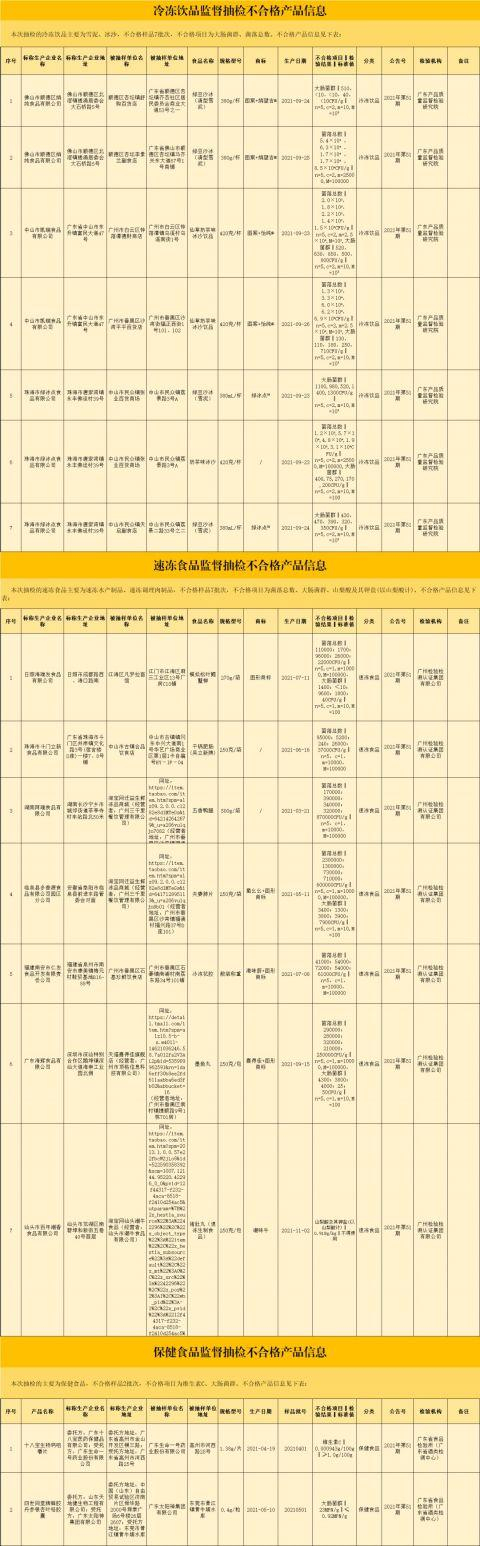 根据2021年国家和广东省食品安全监督抽检计划,广东省市场监督管理局组织抽检调味品、冷冻饮品、速冻食品、茶叶及相关制品、保健食品、餐饮食品、食用农产品和其他食品等8类食品926批次样品。根据食品安全标准检验和判定,其中抽检项目合格样品889批次、不合格样品37批次,检出微生物污染、重金属污染、食品添加剂超范围使用及其他指标问题。