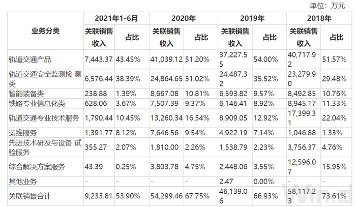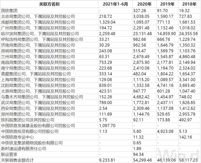 财务数据显示,国铁科技2018年、2019年、2020年以及2021年上半年营收分别为7.90亿元、6.89亿元、8.01亿元、1.71亿元;同期净利润分别为7,271.47万元、1.09亿元、1.08亿元、-1513.25万元。而公司向控股股东、实际控制人及其控制企业关联销售金额占营业收入的比例分别为73.61%、66.93%、67.75%和53.90%,整体占比虽有下降趋势但依然维持在相对较高水平。