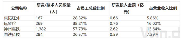 在研发创新方面,国铁科技的研发人员数量占比和研发费用占比与康拓红外较为接近,但落后于远望谷和神州高铁。此外,在设备制造能力方面,国铁科技也是相对欠缺的,这对公司快速响应市场需求形成了一定的制约。本次募投项目中“天津武清研发和制造中心建设”就是为了补充公司的生产制造能力,提高公司产品的市场占有率。