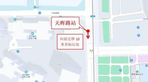 “天晖路”(41723)向前迁移20米至地面标记处,涉及停靠线路:G93路、G72路、161路、298路、1101路。