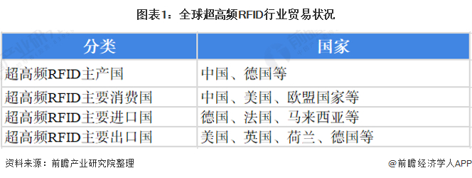 全球超高频RFID行业贸易中,由于中国、德国超高频RFID生产条件优越,技术发展水平高,超高频RFID生产能力较强。从主要消费国来看,中国、美国及欧盟国家超高频RFID应用范围广,超高频RFID消费量较高。
