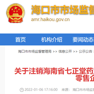 中国质量新闻网讯 2022年1月6日,海口市市场监督管理局网站发布关于注销海南省七正堂药业连锁经营有限公司鹏晖广场分店等三十八家药品零售企业《药品经营许可证》的公告。