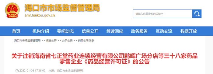 海口市市场监督管理局:38家药品零售企业《药品经营许可证》注销