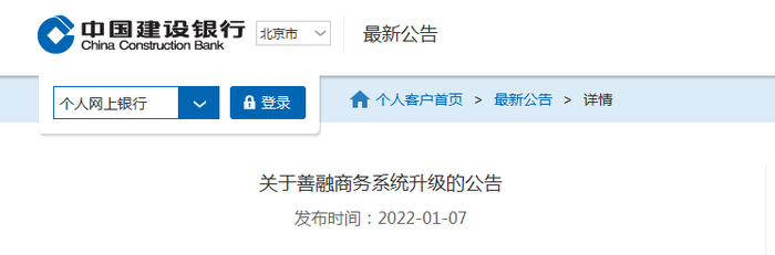 中国建设银行官网1月7日发布公告。