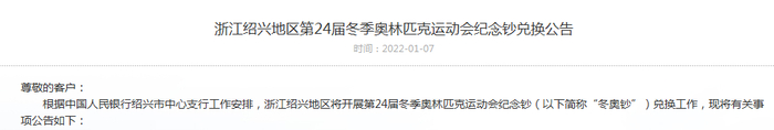 根据中国人民银行绍兴市中心支行工作安排,浙江绍兴地区将开展第24届冬季奥林匹克运动会纪念钞(以下简称“冬奥钞”)兑换工作,现将有关事项公告如下: