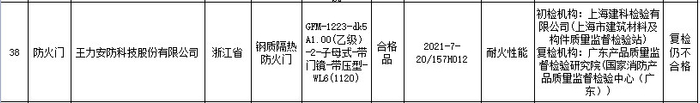 本次抽查重点对启闭灵活性、可靠性、门扇开启力、耐火性能、防火锁耐火性能、防火合页(铰链)耐火性能等项目进行了检验。其中,上市公司“王力安防科技股份有限公司”生产的一款“钢质隔热防火门”被检出“耐火性能”不合格,复检仍不合格。不合格产品规格型号为GFM-1223-dk5 A1.00(乙级)-2-子母式-带门镜-带压型-WL6(1120),生产日期/批号为2021-7-20/157H012。值得一提的是,该产品经过上海建科检验有限公司(上海市建筑材料及构件质量监督检验站)和广东产品质量监督检验研究院〔国家消防产品质量监督检验中心(广东)〕复检均不合格。