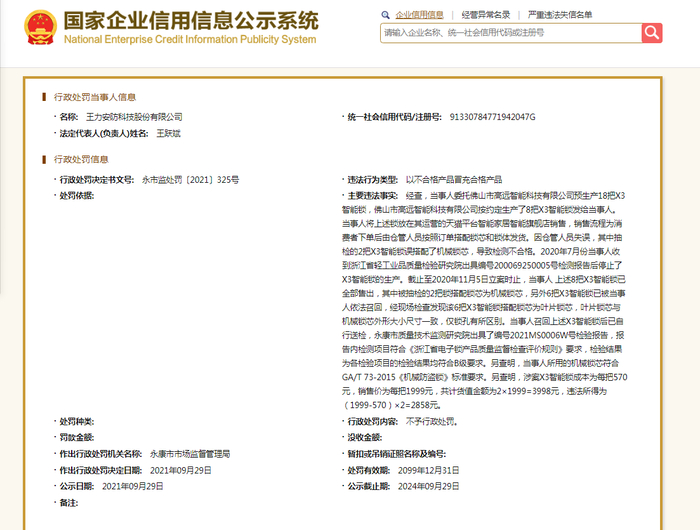 此外,据国家企业信用信息公示系统,2021年9月,永康市市场监管局的一则行政处罚决定书披露,当事人(王力安防)委托佛山市高远智能科技有限公司预生产18把X3智能锁,佛山市高远智能科技有限公司按约定生产了8把X3智能锁发给当事人。当事人将上述锁放在其运营的天猫平台智能家居智能旗舰店销售,销售流程为消费者下单后由仓管人员按照订单搭配锁芯和锁体发货。因仓管人员失误,其中抽检的2把X3智能锁误搭配了机械锁芯,导致检测不合格。2020年7月,当事人收到浙江省轻工业品质量检验研究院出具编号200069250005号检测报告后停产X3智能锁。截至2020年11月5日立案时止,当事人上述8把X3智能锁已全部售出,其中被抽检的2把锁搭配锁芯为机械锁芯,另外6把X3智能锁被召回。
