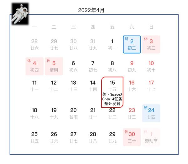 SpaceX公司预计在美国当地时间2022年4月15日为NASA将Crew-4宇航员送上国际空间站。这组宇航员将搭乘SpaceX的“载人龙飞船”(Crew Dragon)到达国际空间站,以接替2021年11月到达空间站的Crew-3四人组,并在环绕地球运行的微重力实验室里开展为期半年的研究。