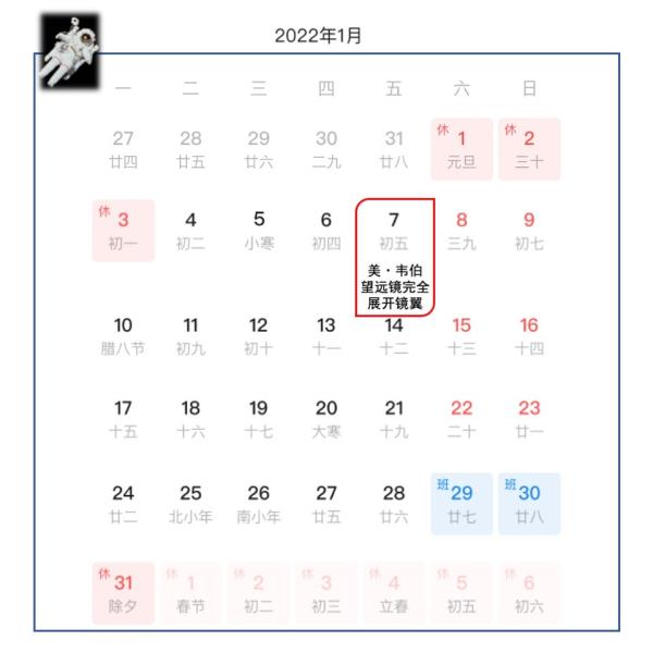 韦伯望远镜发射后的第13天(北京时间2022年1月7日)又将迎来作为一个重要的里程碑。按照预定的时间线,彼时韦伯望远镜将完全伸展自己的镜翼,标志着韦伯望远镜完成在太空中的展翼部署。