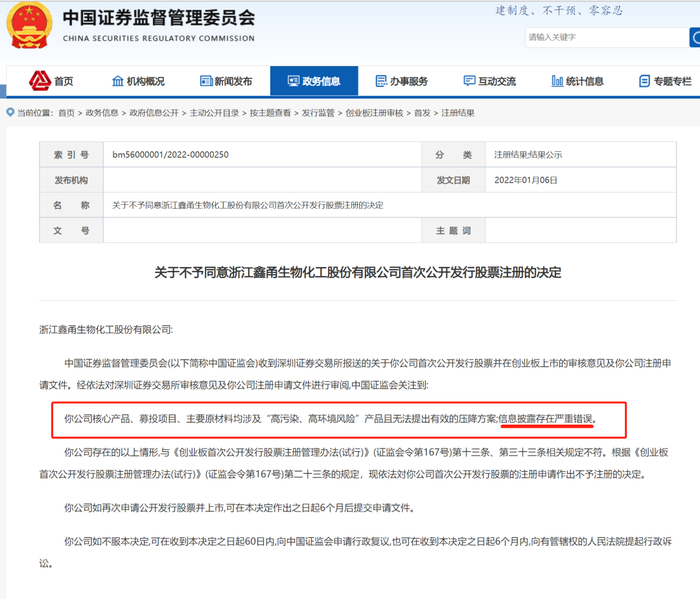 “经依法对深圳证券交易所审核意见及你公司注册申请文件进行审阅,中国证监会关注到:你公司核心产品、募投项目、主要原材料均涉及“高污染、高环境风险”产品且无法提出有效的压降方案;信息披露存在严重错误。”在证监会日前公布的不予同意鑫甬生物IPO注册的决定相关公告中,如此解释其遭遇“否决”之由:”公司存在的以上情形,与《创业板首次公开发行股票注册管理办法(试行)》(证监会令第167号)第十三条、第三十三条相关规定不符。根据《创业板首次公开发行股票注册管理办法(试行)》(证监会令第167号)第二十三条的规定,现依法対你公司首次公开发行股票的注册申请作出不予注册的决定。