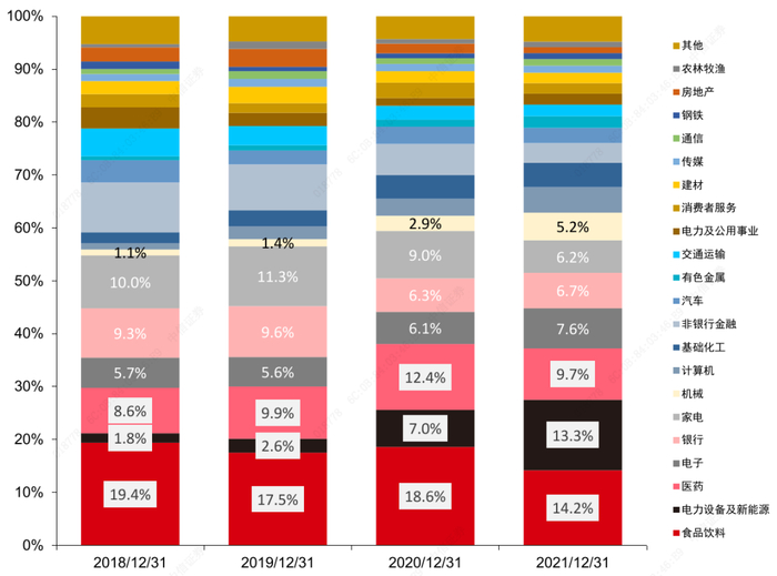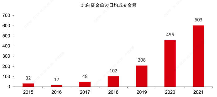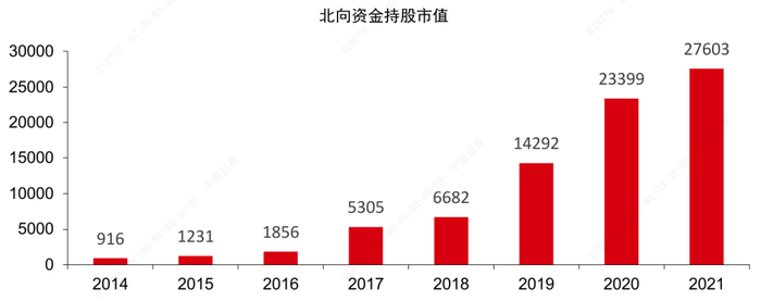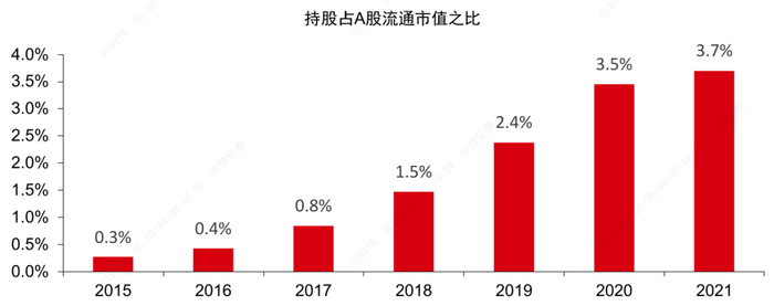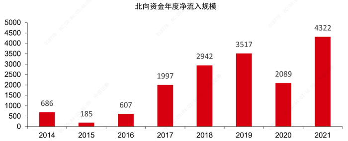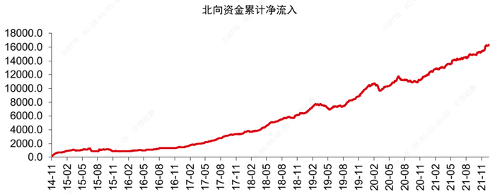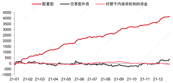 2021年北向资金净流入突破4000亿,创历史新高。2021年北向资金累计净流入4322亿元,超过2019年的3517亿元创历史新高,较2020年的净流入规模+107%。自2014年互联互通开设以来,北向资金已累计净流入16346亿元,持有A股市值27603亿元,占全部A股流通市值的3.7%。若按照成交均价估算,2021年配置型资金累计净流入4173亿元,交易型资金净流入397亿元,说明尽管A股市场2021年波动较大,指数全年表现不及2019-2020年,但海外资金增持A股市场的意愿非常强烈。截至2021年12月31日,配置型资金持股占全部外资的78.5%,交易型资金持股占全部外资的17.1%,托管于内港资机构的资金持股占北向资金整体的4.4%。