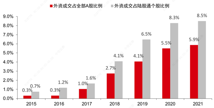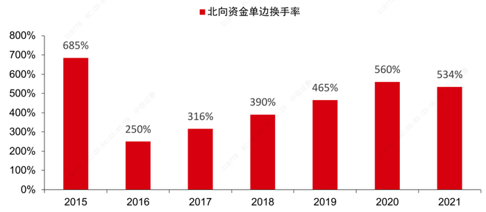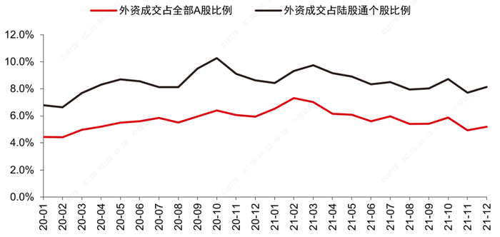尽管净流入规模较高,但外资并未对A股过去一年的巨量成交有显著贡献。2021年A股市场共116个交易日的成交额突破1万亿,远高出2020年的47个交易日,舆论一度揣测是来自海外的量化交易对A股成交产生了一定影响。但从持股占比和成交占比来看,外资的占比并未随着同比大幅净流入而有类似显著的提高幅度。尽管2021年北向资金净流入规模是2020年的2倍,但2021年的持股占比较2010年末仅提高0.2ppts,相比之下2020年较2019年提高了1.1ppts,说明A股流通市值的提高更主要来自于内地资金持有流通股份的增多;从成交活跃度来看,北向资金日均单边成交额(买入+卖出绝对值的平均)在2021年达到603亿元,仅比2020年提高了32%,这一增速在2020年为119%,外资单边成交占全部A股总成交的比例从2020年的5.5%提高了0.4ppts至2021年的5.9%,提高幅度低于2020年较2019年的变化为+1.4ppts,2021年内的月度变化显示,外资的成交占比自1Q21不断下滑,从2月份的7.3%降至12月的5.2%,若将指标换成外资仅能购买的陆股通股票,我们也能得到类似结论;换手率方面,外资的年度换手率从2020年的560%下降至2021年的534%,降低了26pcts。
