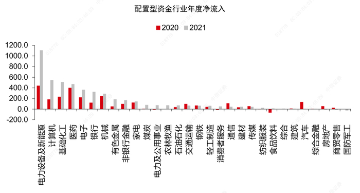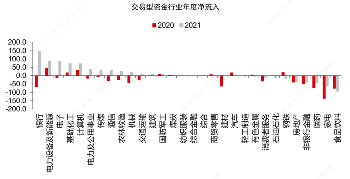 2021年配置型资金主要净流入新能源和计算机,主要净流出国防军工和商贸零售,交易型资金主要净流入银行和新能源,主要净流出食品饮料、家电等。科技制造是2021年北向资金配置的重点方向,配置型资金全年围绕锂电产业链布局,共净增持1107亿的电力设备及新能源,另外配置了锂电中上游相关的基础化工个股(+509亿元),交易型资金主要净流入银行(+147亿元)和电力设备及新能源(+89亿元),此外计算机也是配置型资金(+547亿元)和交易型资金(+74亿元)今年重点增持的行业。消费是外资今年主要减持的板块,集中在食品饮料和家电,抛压主要来自于交易型外资,相比之下配置型外资全年保持中性配置。