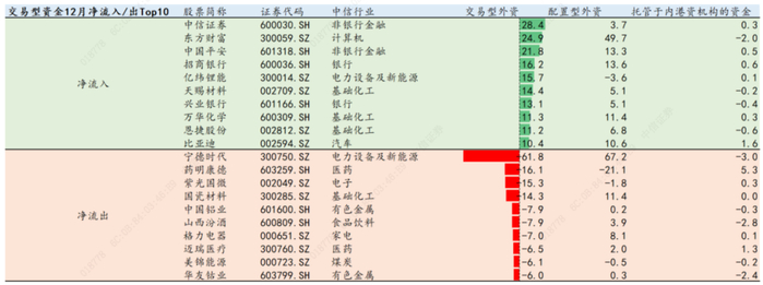 12月外资开始恢复对于金融和消费板块的配置。12月配置型资金净流入行业前三依然是计算机(+102亿元)、新能源(+92亿元)和基础化工(+70亿元),同时也恢复净流入食品饮料(+52亿元)。交易型资金的增持行业更凸显价值蓝筹风格,其净流入的前三行业依次为银行(+71亿元)、非银行金融(+62亿元)和食品饮料(+50亿元)。