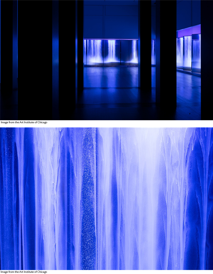日本艺术家千住博 (Hiroshi Senju)将极简主义的视觉语言与日本传统绘画(Nihonga)的精粹融合,运用荧光颜料创造出他最具代表性的系列作品——《瀑布》。