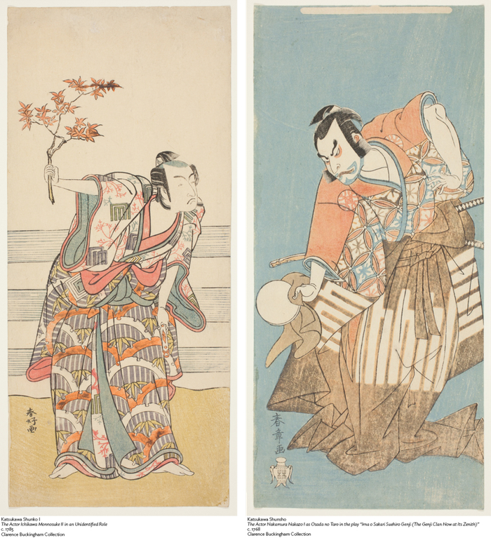 江户时代(1603年—1868年)的日本,城市文化繁盛,艺术发展蓬勃,描绘风土人情的版画受到老百姓空前欢迎。不论是贵族生活,还是花街柳巷,亦或是自然风光,在版画家眼中,世间的一切都能成为他们的题材。18世纪,胜川春章(Katsukawa Shunsho)凭借刻画歌舞伎(Kabuki)的役者绘(yakusha-e),一跃成为当时举足轻重的艺术家之一。他对每一位表演者的神态、动势以及道具捕捉细致,以写实的手法传神地展现他们略微不同的性情和心理活动。