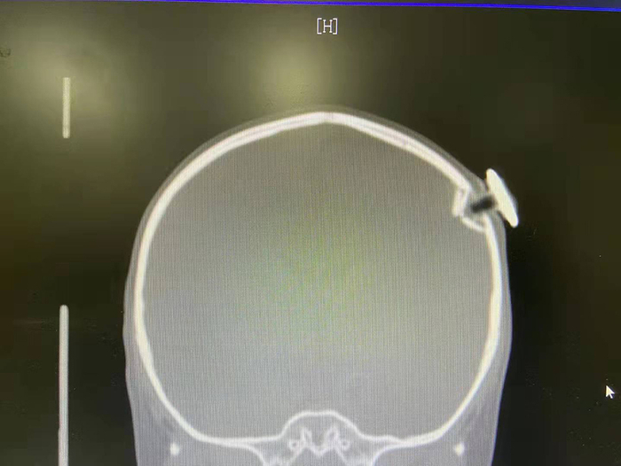 根据CT检查显示,这枚磁力钉撞碎了孩子颅骨,一头扎进大脑约1.3厘米,造成左侧顶骨凹陷性骨折和脑外出血,而且刺破脑膜,差点就损伤了脑部的功能区。