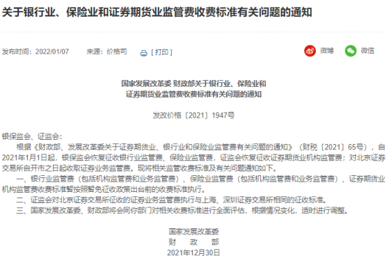 据国家发改委1月7日消息,根据《财政部、发展改革委关于证券期货业、银行业和保险业监管费有关问题的通知》(下称《通知》),自2021年1月1日起,银保监会恢复征收银行业监管费、保险业监管费,证监会恢复征收证券期货业机构监管费;对北京证券交易所自开市之日起收取证券业务监管费。
