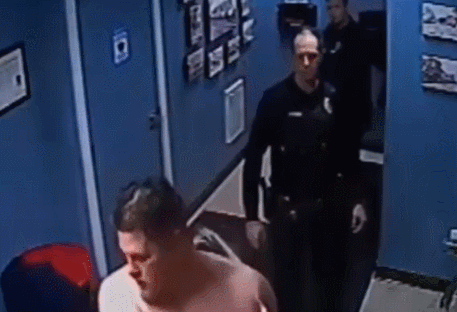 监控录像分为两部分。第一部分录像显示,29岁男子杰森·琼斯摇摇晃晃地走进警察局大厅,并与两名警察交谈了几句,但由于录像没有录音,因此无法确定谈话的内容。视频最后,琼斯当着3名警察的面,脱下衣服、鞋子和袜子。当时他面前的折叠桌上摆着一瓶消毒洗手液。