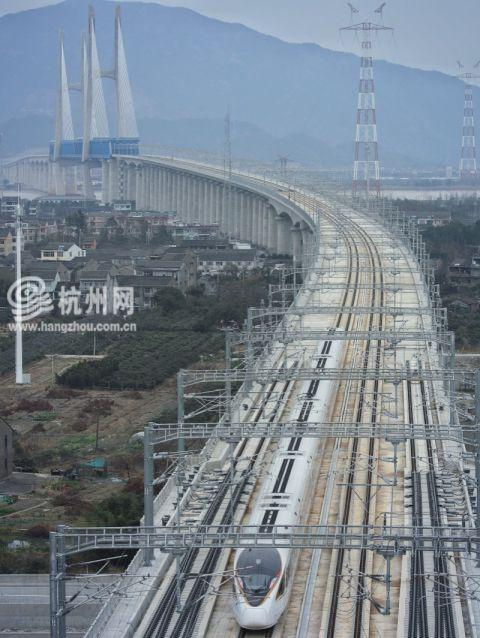 记者实拍杭台高铁列车驶过台州椒江特大桥