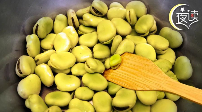 蚕豆在我们平阳萧江老家,称之为槐豆(弯豆)。我长大之后,在杭州就学时,才发现食堂窗口的菜单上写着的蚕豆,就是我们老家常说的槐豆(弯豆)。可能是蚕豆的豆荚长得如一弯月亮般,也可能是蚕豆的头上长着如女人弯弯的黑眉毛般,我的祖先才给它取了这样富有诗意的名字。宋代的释行海《暮春词》写道:“春风荡桨落花时,江鼓冬冬舞柘枝。雨洗樱红蚕豆绿,金衣公子可怜谁”,说的就是诗意的槐豆。