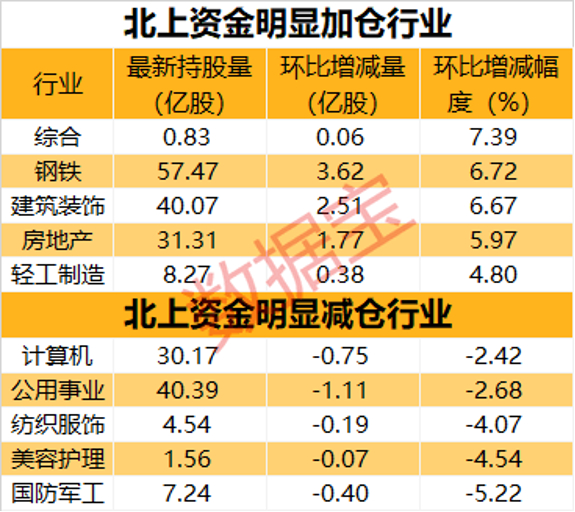 统计显示,本周北上资金持股量环比增加的行业共19个,环比减少的行业12个。综合行业持股量环比增幅最大,较上周增长了7.39%,其次是钢铁、建筑装饰、房地产行业,环比增幅分别为6.72%、6.67%、5.97%,