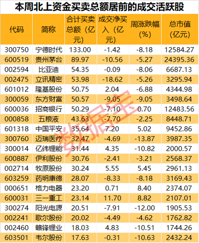 数据宝统计显示,本周共有33股登上北上资金成交活跃榜。所属行业来看,上榜个股中,电气设备、食品饮料、电子行业成交金额均超过百亿元,机械设备股获净买入最多,合计11.7亿元,电子行业净卖出最多,共29.99亿元。