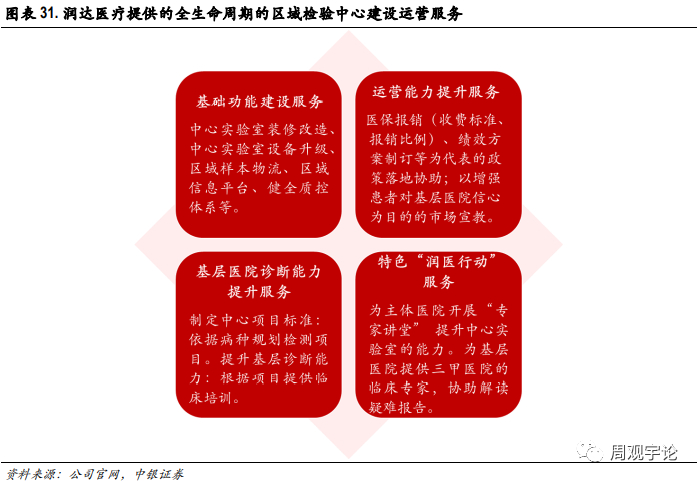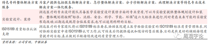 针对实验室成本管控,实现实验流程优化、设备选择合理化、试剂管理信息化、运营成本精细化、检测标准化,提供包括仪器设备维修等基础技术支持、实验室过程管理、质量控制管理等服务。针对实验室检测能力和水平提升,提供了包括临床教育培训、实验报告解读服务、既有检测项目临床推广、新产品新技术临床培训服务、学术交流及提供学科建设支持等系列增值服务。同时公司还为各级医疗机构提供特色专科建设整体化服务,如为微生物、病理、分子诊断、影像、透析等专科领域提供一体化解决方案。公司通过提供以上综合服务,提升大型 IVD 渠道综合服务商的服务价值属性,帮助医院实现降本增效的目的,符合国家医改及产业发展趋势。