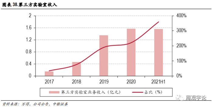 其中华北、东北两地区, 2020 年上半年受疫情影响较大,营收及利润出现阶段性下滑,从 2020年下半年开始,两个地区疫情得到有效控制,各项业务开始逐步恢复,2021年上半年两个地区业务呈现快速增长,较去年同期保持了 70%左右增长,较 2019 年同期保持了 20%左右的增长。西南地区作为公司进一步深化和拓展集约化和区域检验中心业务的重要地区,2021年上半年实现营业收入较上年同期增长了 24.37%,较 2019 年同期增长41.83%,呈现较高速增长。华中地区主要系武汉地区子公司在 2020 年疫情期间为重点抗疫医学实验室供应了相关设备和试剂, 2020 年上半年保持了较快速增长,2021年上半年随着疫情逐步得到控制,该地区子公司疫情检测相关业务占比下降,但常规业务快速恢复高增长,整体收入水平较去年同期增长 2.45%,较 2019 年同期增长60.21%,保持了较快的增长。