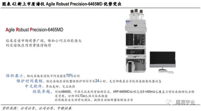 2021年12月初公司新上市质谱仪Agile Robust Precision-6465MD是公司工业板块业绩增长的又一引擎,也更是公司研发实力的体现。该产品优势突出:体积小巧,占用更有限的实验室空间;维护时间最短,相比其他质谱仪整体维护时间节省24小时;中文软件,界面友好,交互性强,后续配套全自动前处理仪,提供质谱检测整体解决方案。