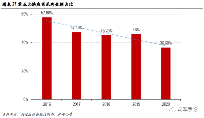 上游行业是体外诊断产品制造行业,主要供应商由2003年的1家增加到2019年的28家,逐步与国内外知名制造商达成合作。前五大供应商的采购金额占比呈现逐年下降的趋势,2020年前五名供应商采购额 19.25亿元,占年度采购总额 36.6%。