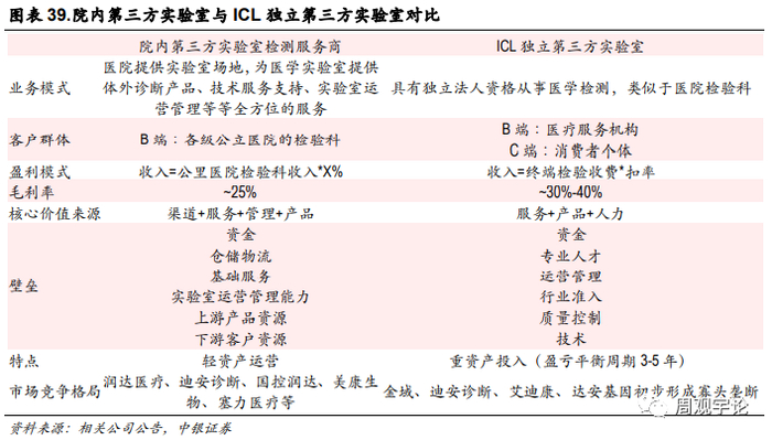 与院内第三方实验室检测服务商不同,ICL具有独立法人资格,服务的客户群体除了医疗服务机构外还有消费者个体,所获的毛利率也更高,主要竞争者为金域、迪安诊断、艾迪康、达安基因。