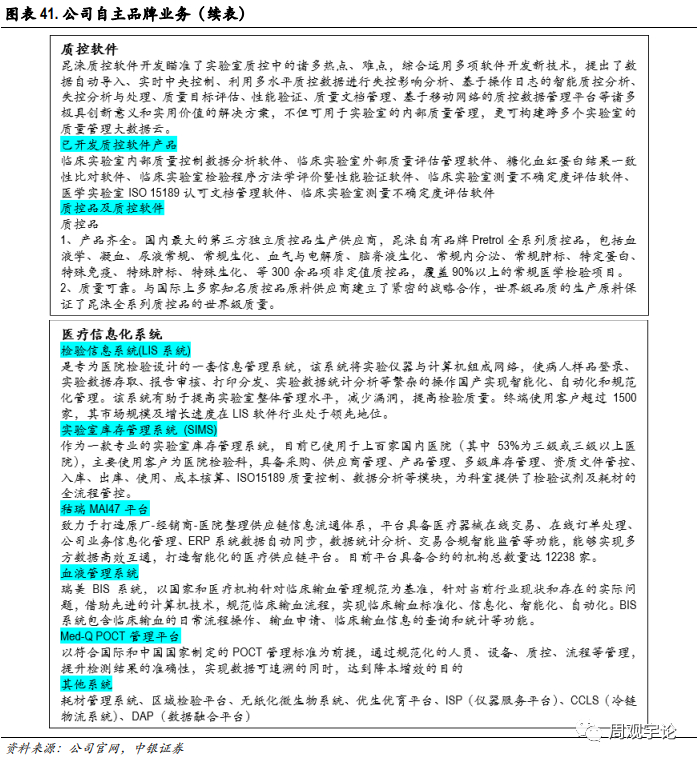 件系统平台,包括LIS系统(医学实验室信息系统)、BIS系统(临床输血质量管理系统)、POCT质量管理平台、SIMS系统(实验室试剂库存管理系统)、Mai47系统(医疗供应链协同云平台)、ISP系统(仪器服务平台)、CCLS(冷链物流系统)、DAP(数据融合平台)等,为客户提供了丰富的信息化系统及相关软件服务。同时,公司也积极对临床信息化业务产品线进行拓展及升级,积极开展区域性信息平台的搭建,进一步丰富公司信息化产品线,巩固了公司在检验领域信息化系统开发建设的领先水平。