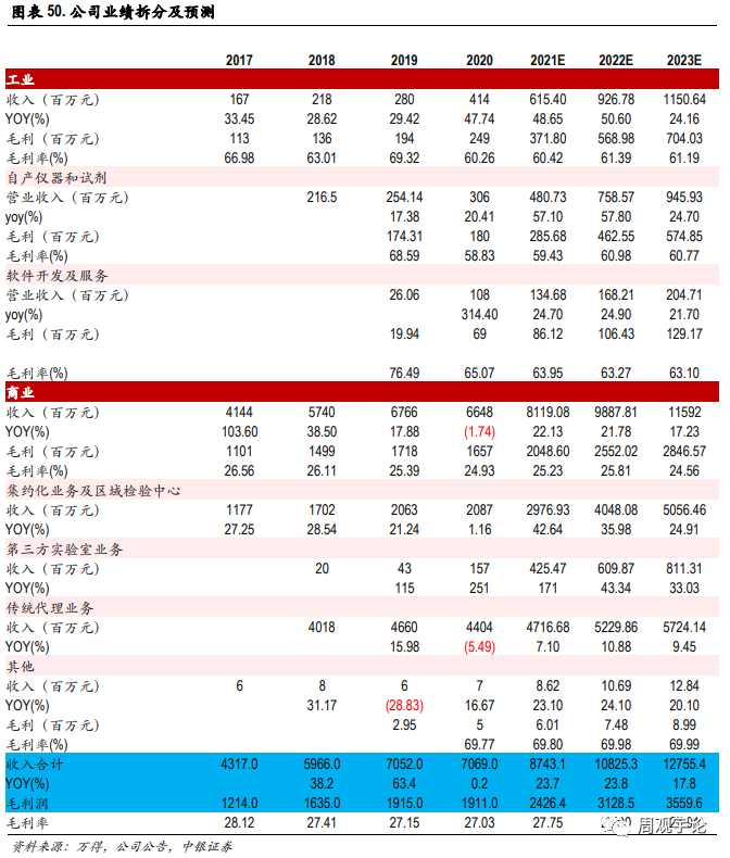 根据我们预测与拆分,预计公司2021-2023年商业板块营收81.19/ 98.88/115.92亿元,其中集约化业务/区检业务中心 2021 -2023营收29.77/40.48/50.56亿元;第三方实验室业务 2021 -2023年营收4.25/6.10/8.11亿元;传统代理业务 2021-2023年营收47.17/52.30/57.24亿元。公司2021-2023工业板块营收6.15/ 9.27/11.51亿元,其中自产产品业务 2021-2023年营收4.81/7.59/9.46亿元。