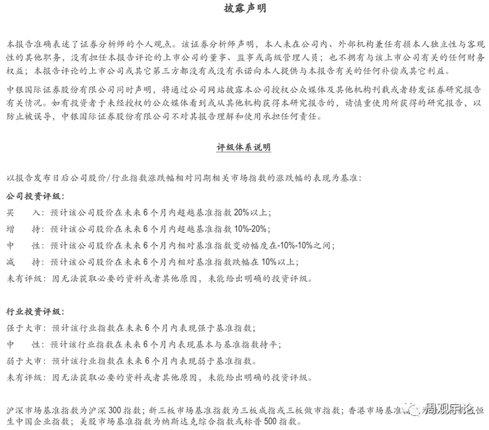 中银国际证券股份有限公司同时声明,将通过公司网站披露本公司授权公众媒体及其他机构刊载或者转发证券研究报告有关情况。其他相关机构如果准备转发本报告或者报告摘要的,需与中银国际证券股份有限公司相关部门做出协议约定,明确转载或者转发责任,并注明证券研究报告的发布人和发布日期,提示使用研究报告的风险。未经中银国际证券股份有限公司授权刊载或者转发研究报告,应当承担相应的法律责任。如有投资者于未经授权的公众媒体看到或从其他机构获得本研究报告的,请慎重使用所获得的研究告,以防止被误导,中银国际证券股份有限公司不对其报告理解和使用承担任何责任。