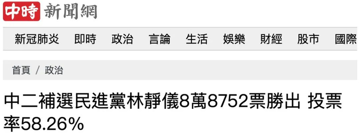 另据台媒报道,台中市第二选区民意代表补选,9日下午5时55分完成包括沙鹿、大肚、乌日、龙井、雾峰等5个区共计258个投开票所开票,有国民党籍颜宽恒、民进党籍林静仪等5人参选。林静仪获得88752票,颜宽恒拿下80912票,林静仪以超出7840票当选,总投票率58.26%。