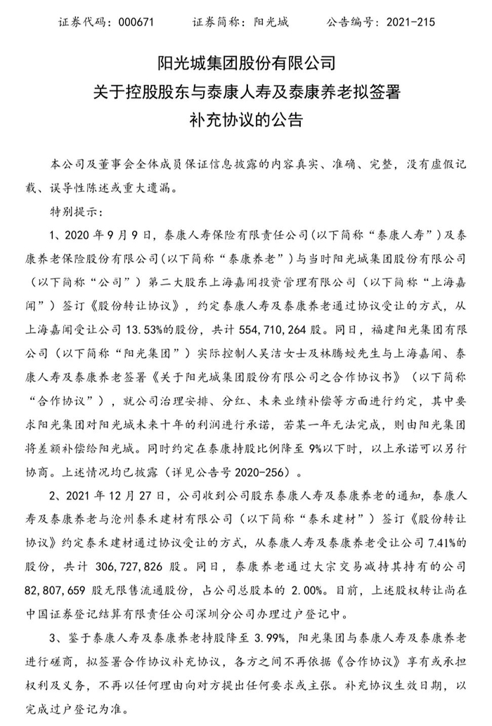 没想到“神队友”牵手一年,双方两败俱伤。12月29日晚间,阳光城对外发布公告称,公司控股股东阳光集团于近日与二股东泰康人寿及泰康养老磋商,就泰康人寿及泰康养老所持公司股份降至 3.99%的情况,双方拟签署合作补充协议。自泰康转让减持股份过户完成之日起,前期签署的《合作协议》自动终止,不再继续履行。