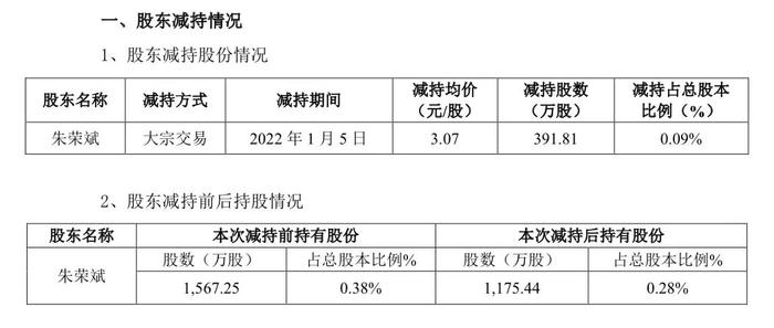这并不是朱荣斌近日来的首次减持。就在不久前,12月22日,朱荣斌减持其持有的公司无限售条件流通股 454.61 万股,占公司总股本 0.1099%。