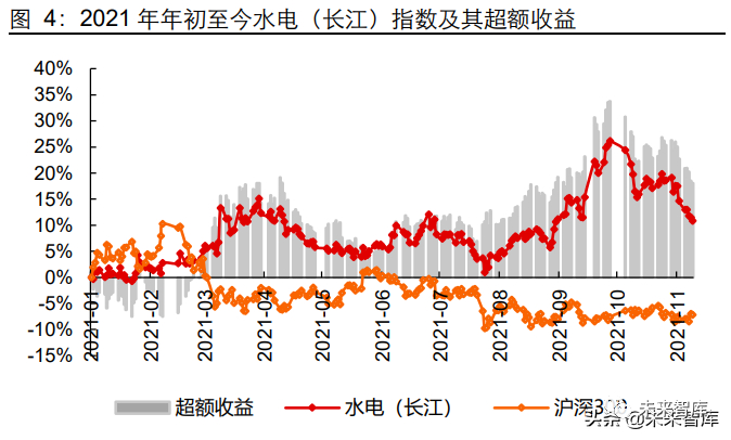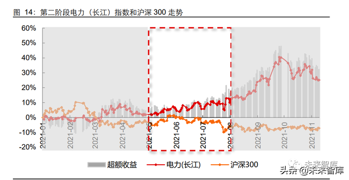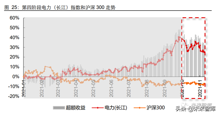 最后一个阶段,即 2021 年 10 月至今,我们认为是此轮行情演绎的第四个阶段,电价 政策阶段性落地后交易层面出现扰动,资本市场表现等待产业基本面回应。“十一”之 后,电力公用行业表现开始出现走弱迹象,在 10 月 8 日至 11 月 12 日期间电力(长江) 指数累计下跌 8.32%、同期沪深 300 指数微跌 0.84%,行业跑输大盘 7.48 个百分点。