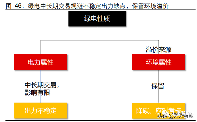 中长期交易规避绿电缺点,双重属性确保交易价格下限。从绿电性质来看,绿电存在电 力属性和环境属性;从电力属性来看,清洁电力与传统能源相比最大的缺点在于清洁能 源电力出力不稳定,也就是说如果从实时平衡角度来看,用户侧使用绿电需要较传统能 源存在一定折价。而从环境属性方面,绿电存在节能降碳的作用,并且可以满足用户的 考核需求,因此需要较传统火电实现一定溢价。然而国家发改委明确提出绿电交易特指 绿电的中长期交易,而中长期交易指的是在规定区间范围内供给一定电量,恰好规避了 绿电出力不稳定的缺点,因此即使绿电交易市场中供给大于需求,绿电仍可以通过发挥 其电力属性获取火电电价,并且用户侧仍然需要对其环境属性付费。